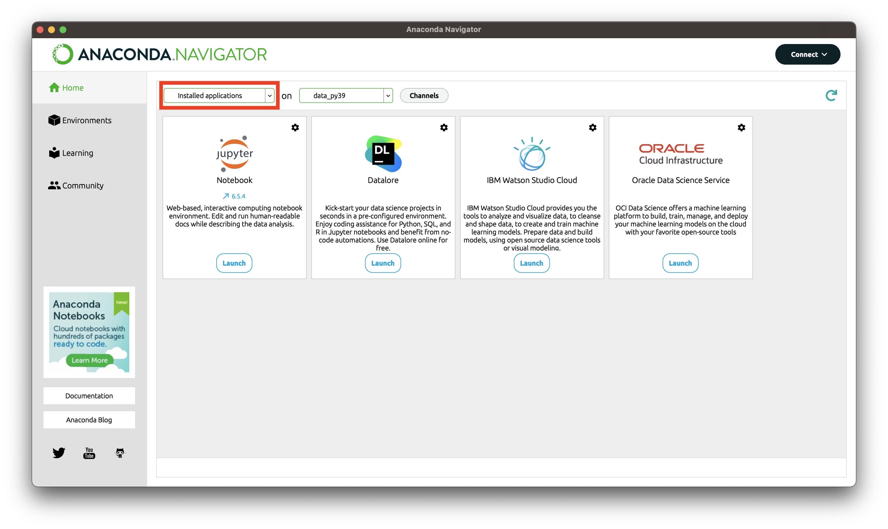 all application에서 installed application로 바꾸어서 확인을 해보았을 때 주피터 노트북 아이콘이 보이므로 잘 설치된 것을 알 수 있다.
