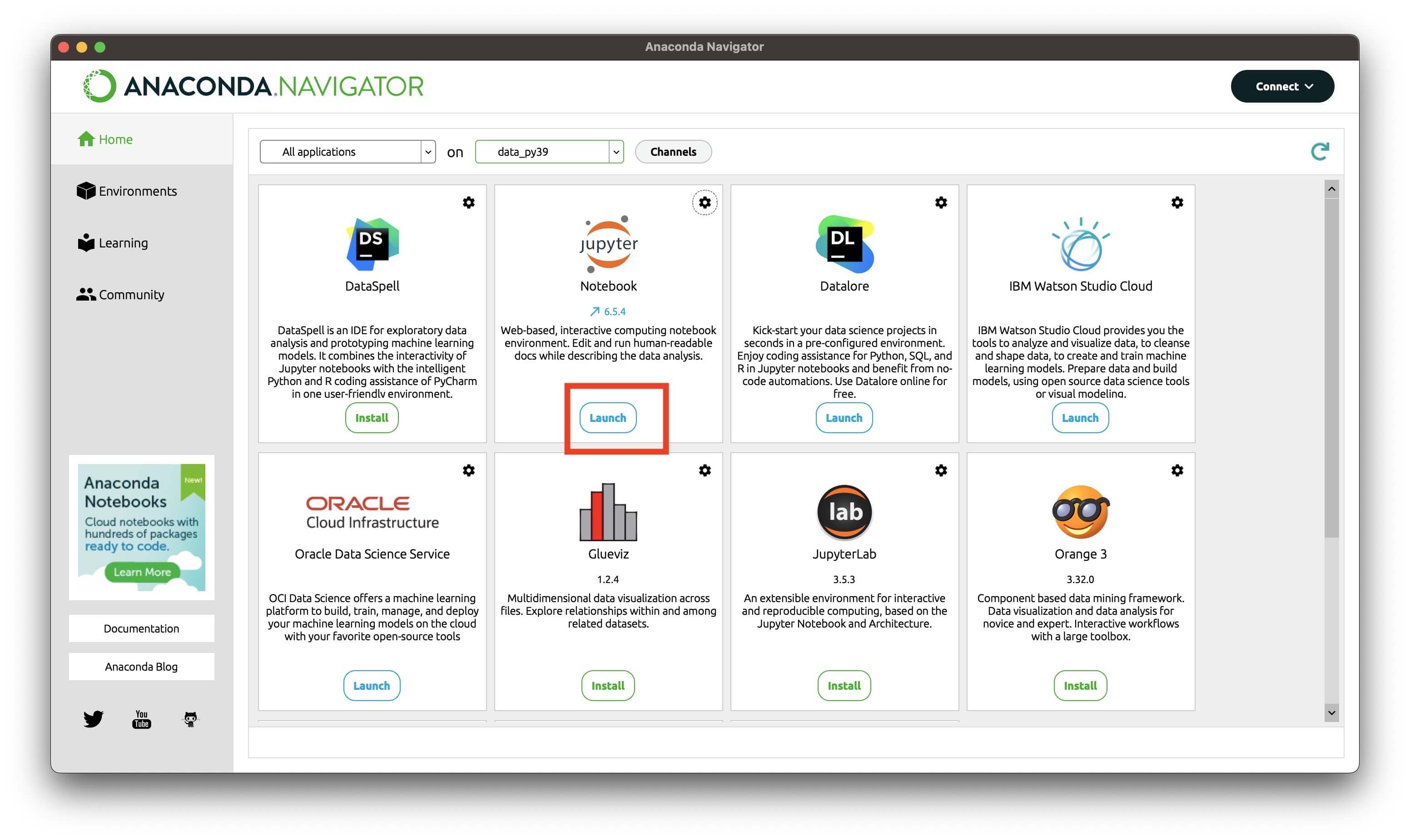 주피터 노트북을 실행하려면 아이콘 아래의 Launch 버튼을 누른다.