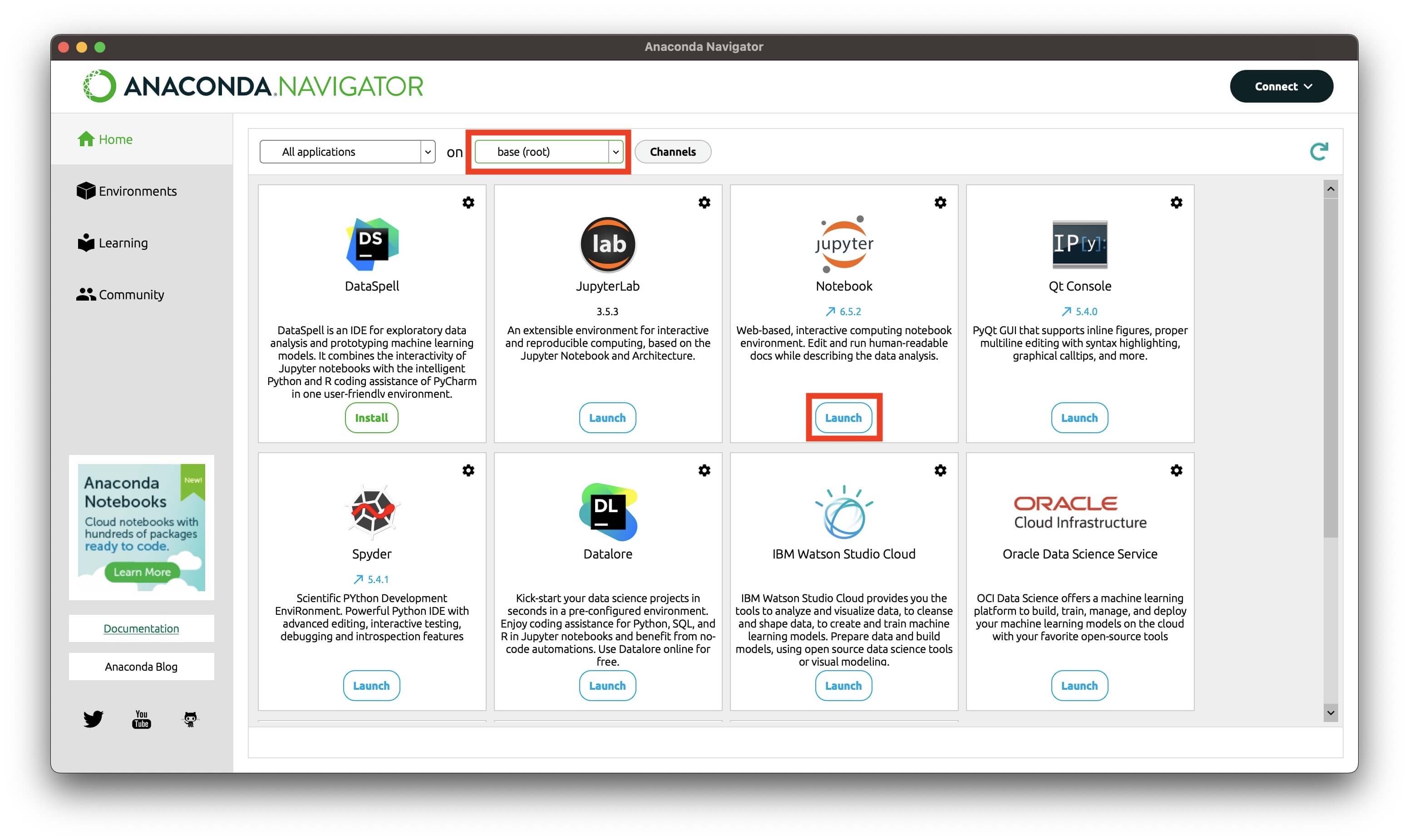 참고로 아나콘다 내비게이터를 실행해 보면 가상환경 활성화 전 디폴트 상태인 base 환경에는 우리가 설치하지 않았는데도 이미 주피터 노트북이 설치되어 있어 아이콘 아래의 버튼이 Launch로 표시되는 것을 볼 수 있다.