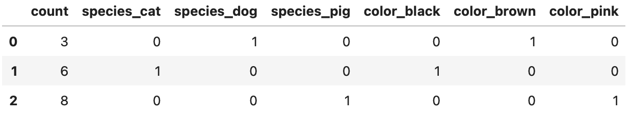 df = pd.DataFrame({'species':['dog','cat','pig'],'color':['brown','black','pink'],'count':[3,6,8]})