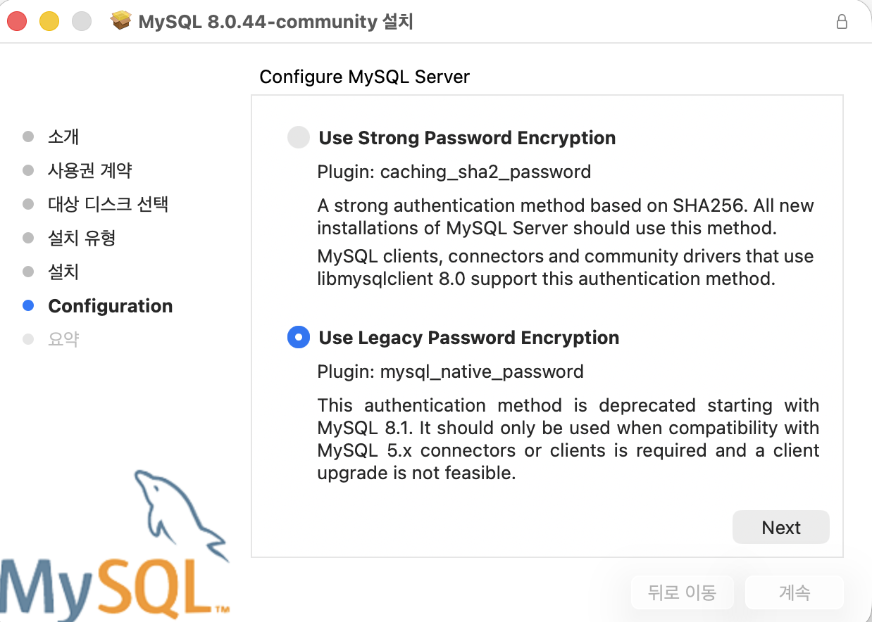 설치 중 비밀번호 설정 방식을 선택할 수 있다. 이때 Default는 Use Strong Password Encryption인데, 나는 Legacy로 선택해서 설치를 해주었다.