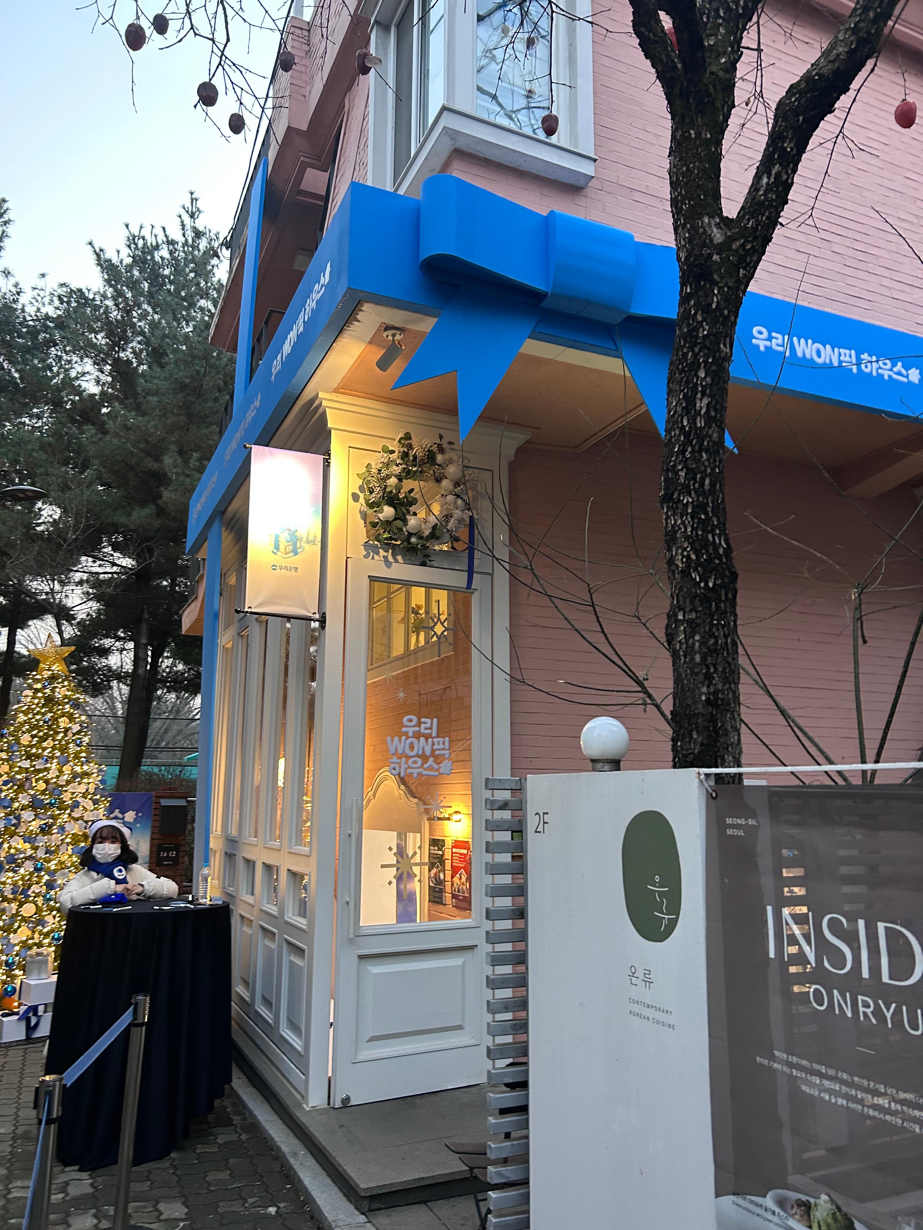 팝업스토어 근처 골목에서 파란 모자 쓴 스탭에게 가면 초대권을 주신다. 팝업스토어는 우리은행의 상징색인 "우리 딥 블루"를 활용해 안팎으로 블루 크리스마스 분위기로 예쁘게 꾸며져 있었다.